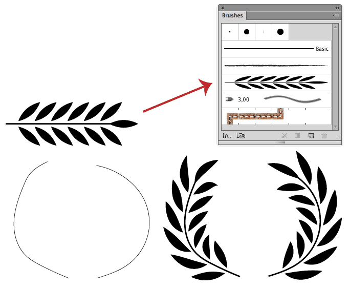 Der Siegerkranz oder wahlweise der Olivenzweig oder Ährenkranz kann ganz einfach mit einem Bildpinsel konstruiert werden. Bauen Sie den Zweig in gerader Form, erstellen daraus einen Bildpinsel und weisen den einem gebogenen Pfad zu. Fertig.
