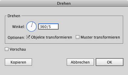 Mit dem Drehen-Werkzeug klicken Sie bei gedrückter Alt-Taste auf den unteren Punkt der Linie. Geben Sie 360/5 in die Dialogbox ein, dann rechnet Illustrator selbst den Winkel aus. Dann klicken Sie auf Kopieren.