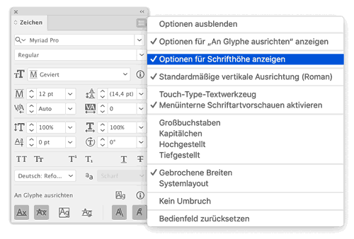 Die Schriftgrößen-Definition in Illustrator entspricht standardmäßig der Kegelhöhe. Seit Version 25.1 lässt sich dies umstellen. Dazu aktivieren Sie im Menü des Zeichen-Bedienfelds »Optionen für Schrifthöhe anzeigen«.