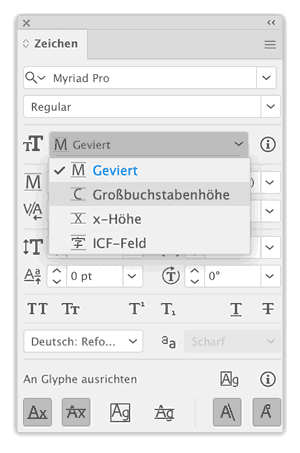 Anschließend können Sie im Zeichen-Bedienfeld den Bezug für die Schriftgröße umstellen.