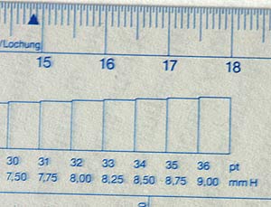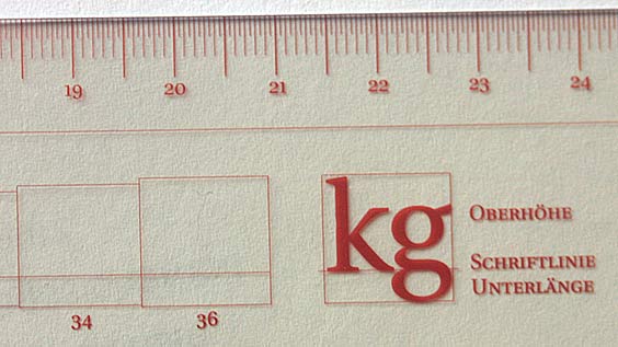 Heutzutage können Sie sich jedoch nicht mehr darauf verlassen, dass eine bestimmte Versalhöhe auf eine bestimmte Kegelhöhe schließen lässt. Daher sollten Sie zum Messen der Schriftgröße auch Typomaße verwenden, deren Skala die Kegelhöhe anzeigt.