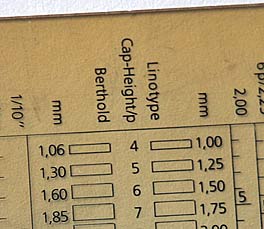 Aus der Fotosatz-Zeit sind viele Typomaße gebräuchlich, deren Skala an die Versalbuchstaben angelegt wurden, um die Größe zu messen. Aus den Bezeichnungen der Typomaße ließe sich schließen, dass das durch die Skala angezeigte Maß dem Punkt-Wert entspricht. Das ist jedoch nicht der Fall. Im Grunde genommen arbeiten diese Typomaße mit einem Dreisatz: wenn der Versalbuchstabe in das Kästchen passt, entspricht die Kegelhöhe (die Gesamthöhe der Schrift plus einem kleinen Abstand) dem angezeigten Wert.