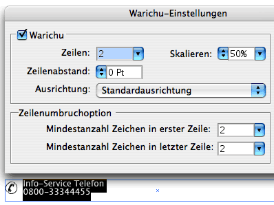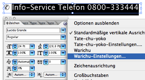 Wenn Sie jetzt einen Textabschnitt auswählen und aus dem Palettenmenü der Zeichen-Palette die Warichu-Einstellungen auswählen, bzw. die Einstellung Warichu direkt aktivieren, wird dieser Abschnitt in dem Abschnitt mehrzeilig gesetzt (bis zu 5 Zeilen). Die Schriftgröße können Sie separat einstellen.