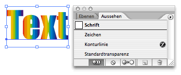 Der Container dagegen kann beliebige Eigenschaften annehmen (in weitgehend beliebiger Ordnung). diese müssen Sie aber erstmal zuweisen. Über das Palettenmenü der Aussehen-Palette weisen Sie der Schrift eine neue Kontur (oder Füllung) zu - es ist deswegen egal, weil beim ersten Mal immer beide entstehen. Diese versehen Sie mit den nötigen Eigenschaften. Die Kontur können Sie jetzt entweder mit Hilfe der Aussehen-Palette hinter den Eintrag Zeichen schieben oder Sie verwenden die Kontur-Palette, um Ihre Kontur außen anzuordnen.