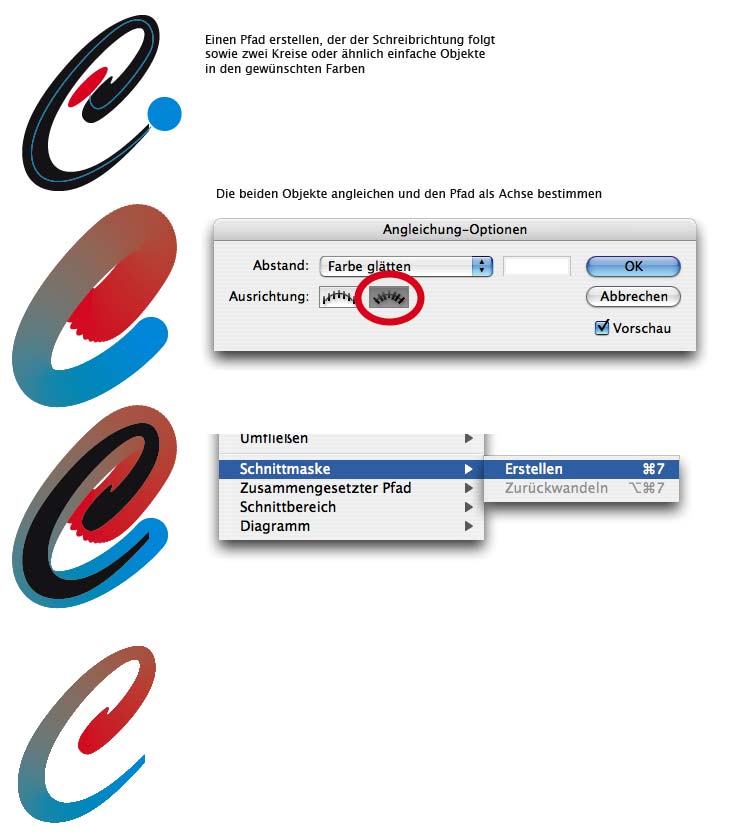 Dann müssen Sie erstmal etwas basteln. Gebraucht wird ein Pfad, der die Schreibrichtung nachzeichnet sowie eine Angleichung. Die Achse der Angleichung ersetzen Sie durch den Schreibpfad. Im Detail