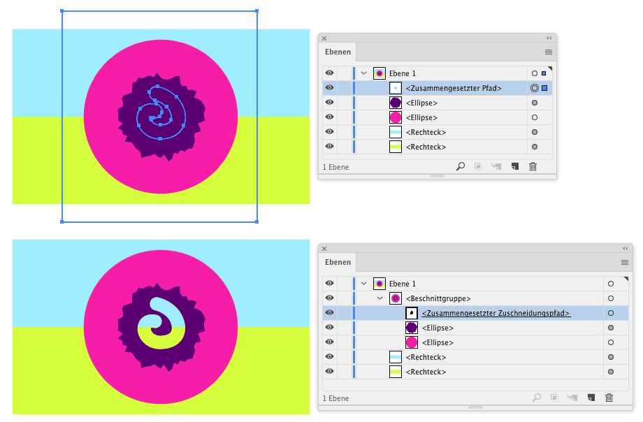 Das entstandene Objekt ist hinterher nur ein Eintrag im Ebenen-Bedienfeld und wenn man Eigenschaften zuweist, z.B. einen Effekt, dann betrifft er alle beteiligten Unterpfade.