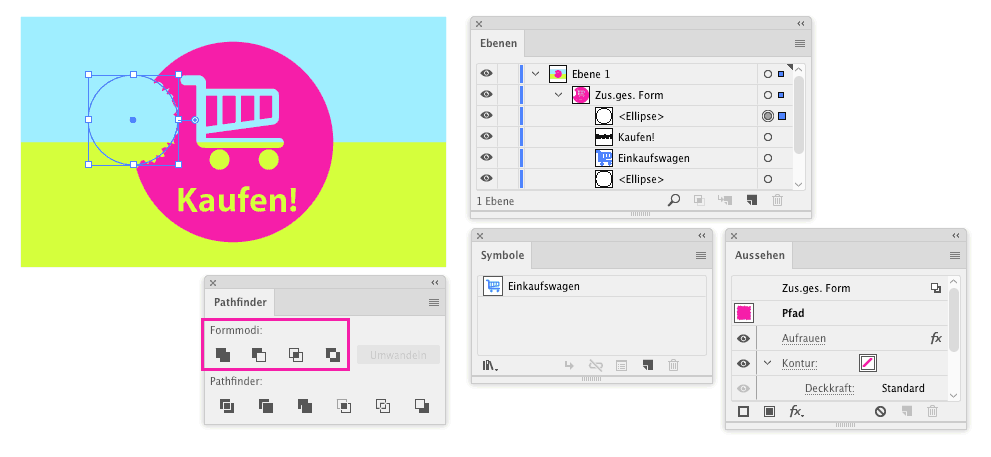 Zusammengesetzte Formen werden gerne mit zusammengesetzten Pfaden verwechselt, in einen Topf geworfen oder komplett ignoriert, aber die Unterscheidung ist wesentlich und bietet einige Vorteile. Zusammengesetzte Formen erlauben nicht nur die Kombination von reinen Pfaden, sondern auch von Text-Objekten und Symbolinstanzen und man kann außerdem alle Funktionen der oberen Reihe im Pathfinder-Bedienfeld verwenden. Einfach die Objekte auswählen, Alt-Taste drücken und einen Button anklicken.