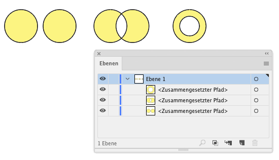 Jeder zusammengesetzte Pfad ist ein Eintrag in der Ebenen-Palette, obwohl es sich um eine nichdestruktive Verbindung handelt, die auch jederzeit zurückgewandelt werden kann. Ihre Behandlung als ein einziger Pfad ist wichtig für Schnittmasken, die aus mehreren Teilen bestehen, z.B. Punktemuster.