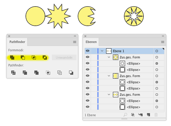 Zusammengesetzte Formen sind komplexere Objekte. Die in ihnen enthaltenen Formen können auf unterschiedliche Arten miteinander interagieren, die man mit den oberen 4 Buttons der Pathfinder-Palette bestimmt, den Formmodi: