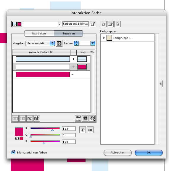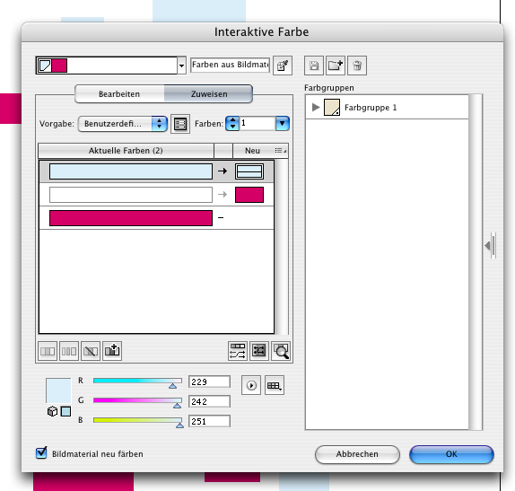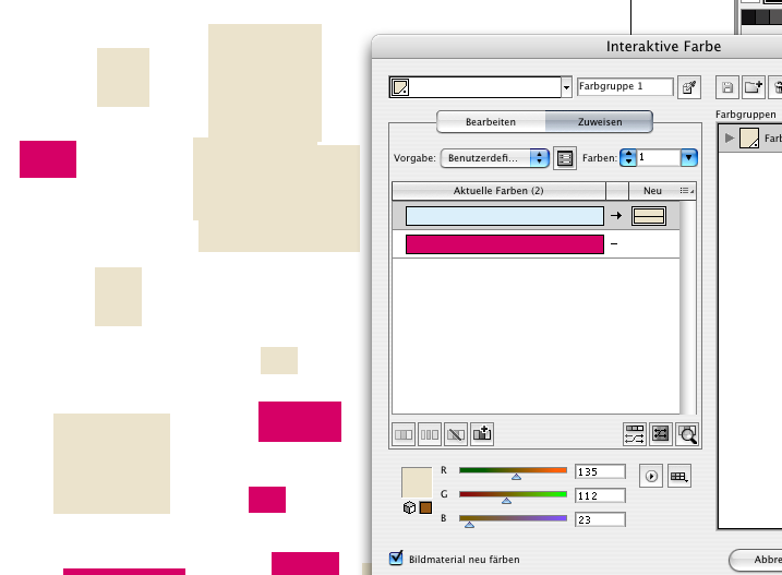 1. Das Farbtonfeld in eine Farbgruppe packen. Dann alle Objekte auswählen und Bearbeiten > Farben bearbeiten > Bildmaterial neu färben