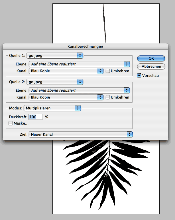 Zuerst benötigen wir eine Auswahlmaske. Bei diesem Motiv lässt sie sich einfach aus einem vorhandenen Kanal erstellen. Den höchsten Kontrast enthält der Blau-Kanal. Diesen mit Hilfe der Kanäle-Palette duplizieren. Die folgenden Arbeiten werden mit dem kopierten Kanal - nicht dem Original - durchgeführt. Eine erste Korrektur mit der Tonwertkontrolle durchführen. Möglich ist auch die Anwendung der Kanalberechnungen, und zwar „Multiplizieren“ des kopierten Kanals mit sich selbst.