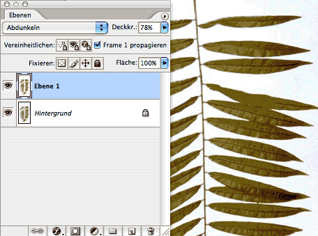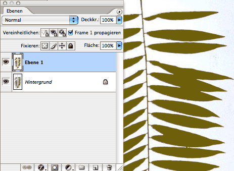 Die letzten hellen Stellen mit dem Pinsel übermalen. Dann eine neue Ebene anlegen und den neuen Kanal als Auswahl laden. Eine Farbe aus den Blättern mit der Pipette aufnehmen und die Auswahl füllen.