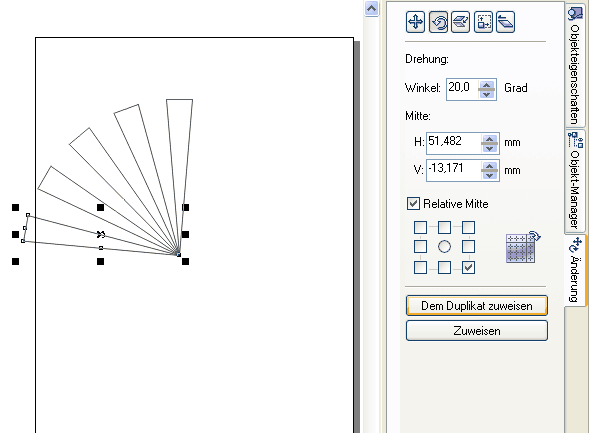 Beginnen Sie mit einem Dreieck - dieses lässt sich mit dem Polygon-Werkzeug bequem erzeugen. Das Dreieck aktivieren Sie und rufen die Palette „Änderung“ auf. Dort stellen Sie eine zu den Maßen der Dreiecks passende Rotation ein. Wichtig ist außerdem die Bestimmung des Referenzpunkts unter „Relative Mitte“. Klicken Sie dann mehrfach „Dem Duplikat zuweisen“, um die benötigte Anzahl Kopien Ihres Dreiecks zu erzeugen.