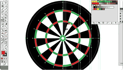Benutzt werden das Radiale-Raster-Werkzeug, Interaktiv malen, eine Pathfinder-Funktion, Intelligente Hilfslinien. Die Raster-Werkzeuge werden gerne mal übersehen, können einem aber viel Arbeit ersparen und sind in Verbindung mit Interaktiv malen wirklich nützlich.