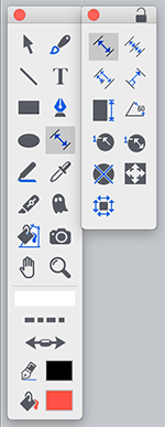 Die Werkzeugpalette sieht zunächst wenig umfangreich aus, aber unter allen Werkzeugen verbergen sich größere Gruppen weiterer Werkzeuge. Die Formwerkzeuge sind eher auf den CAD-Bedarf ausgerichtet; mit Rechtecken und Kreisen aus mehreren Punkten, ineinander liegenden Kreisen, Rastern, Spiralen, Sternen oder einer isometrischen Box. Die Formen sind editierbar.