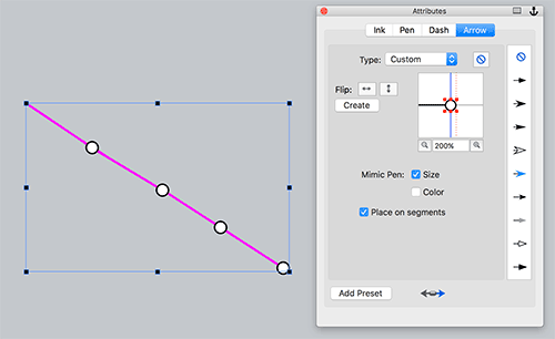 In Canvas kann man Farben als RGB, CMYK, HSL oder Pantone-Farben einstellen, 5 verschiedene Verläufe, Muster, Schraffuren, Texturen zuweisen. Konturen können neben Strichelungen auch kalligrafische Linien, Streifen, Neon-Konturen und Symbol-Konturen erhalten. Interessant sind die Pfeilspitzen. Sie lassen sich so einstellen, dass ein Pfeil oder ein anderes Symbol auf jedem Ankerpunkt sitzt. Eigene Konturenformen kann man nicht erstellen, lediglich die Vorgaben bearbeiten.